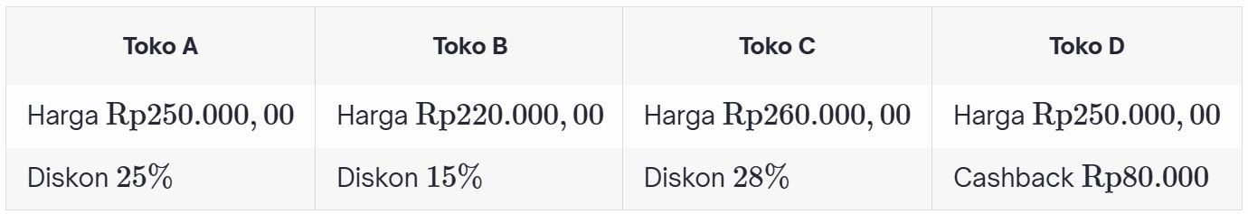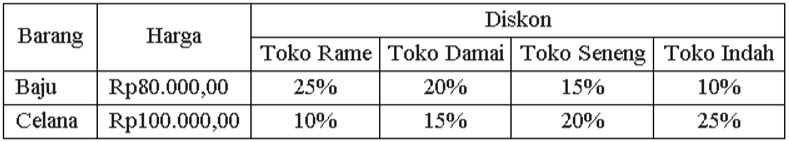 5. Ada empat toko menjual jenis barang yang sama. Daftar harga barang dan diskon seperti pada tabel.